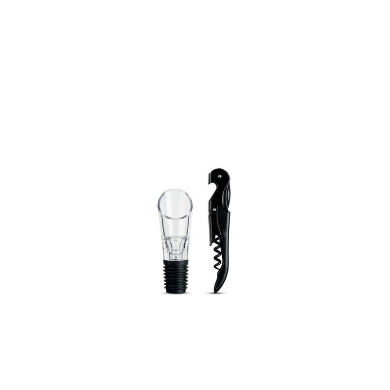 Set de vinho em aço inoxidável, com saca-rolhas e decantador. Um kit de vinho glamoroso, em aço inoxidável, composto por duas peças com quatro funções: abre-cápsulas, saca-rolhas, canivete e decantador. Como brinde completo, este kit vem numa caixa de oferta preta, que pode personalizar com o seu design.