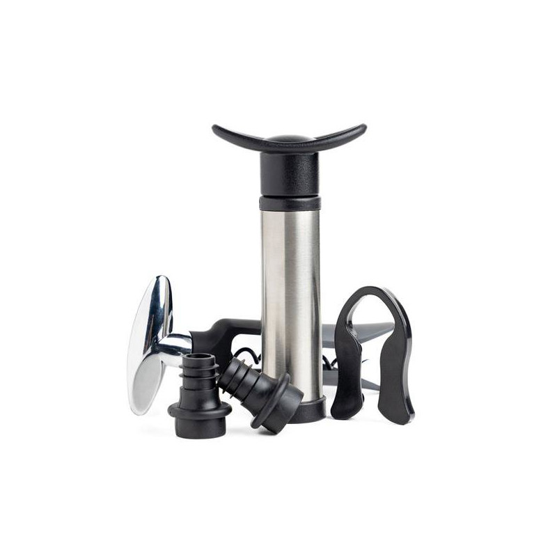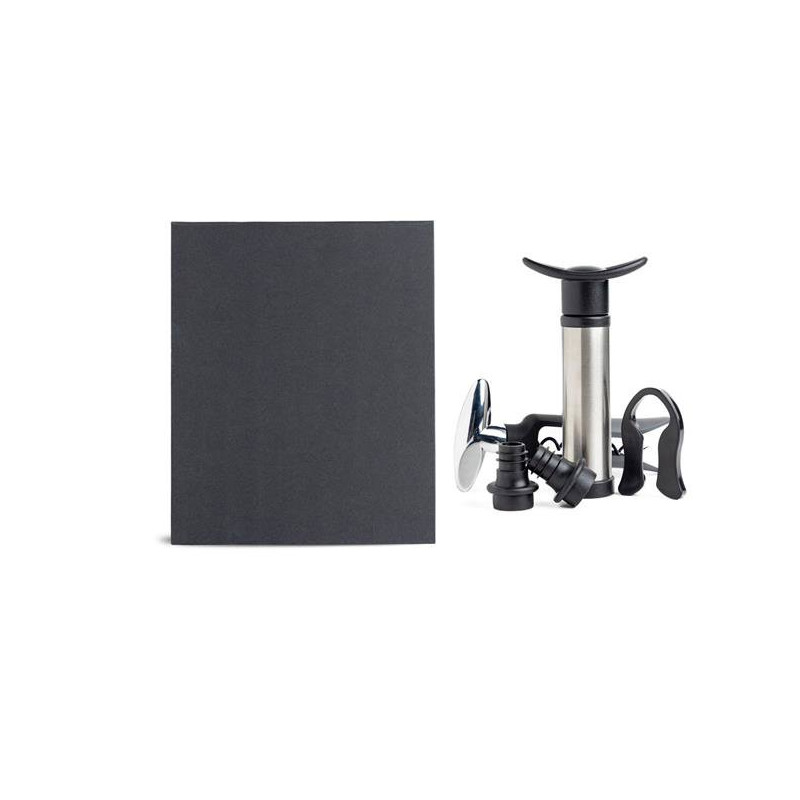 Set de vinho com bomba e rolhas de vácuo, saca-rolhas e corta cápsulas. Este é o brinde ideal para qualquer apreciador de vinhos. Um Kit completo que lhe oferece numa caixa presente magnética um corta-cápsulas e um saca-rolhas para que possa preparar o vinho e, para que o possa guardar sem mexer com as suas propriedades, tem ainda duas rolhas e uma bomba de vácuo. Do incicio ao fim na companhia deste brinde especial. Brindemos à vida!