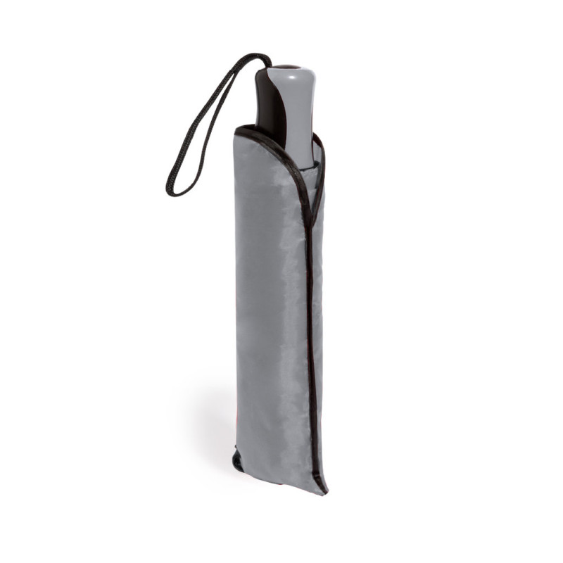 Guarda-chuva dobrável de 8 painéis de poliéster 190T. De abertura manual, com varas metálicas de cor prateada e fecho de velcro. Cabo ergonómico com fita de transporte e bolsa protetora a condizer. Disponível numa ampla gama de cores. Apresentado em bolsa individual reciclada.