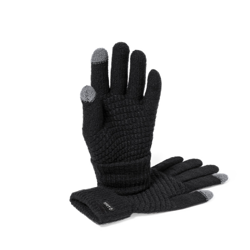 Prático par de luvas para dispositivos com ecrã tátil. De quente e macio acabamento de poliéster RPET. Função tátil no dedo indicador e no polegar. Tamanho único para adulto, com logotipo RPET na etiqueta exterior.O material RPET é fabricado a partir de plástico reciclado, a fim de promover a reutilização de resíduos de plástico e ajudar à sustentabilidade do planeta.