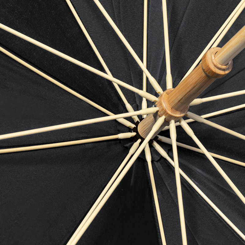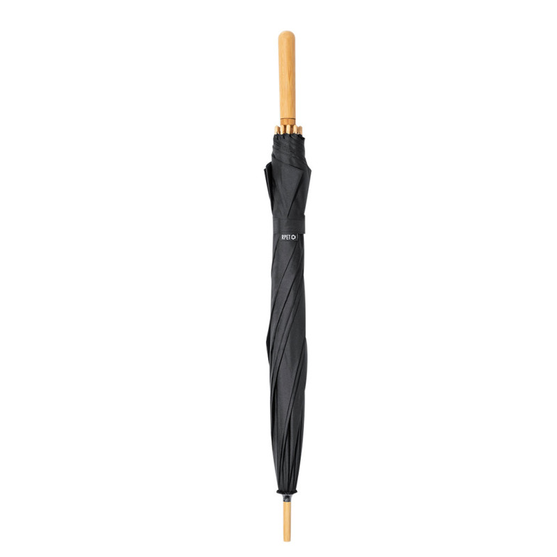 Chapéu de chuva de 105 cm de diâmetro em material pongee 190T RPET. Abertura manual e varetas em fibra de vidro à prova de vento, de elegante cor preta com fecho de velcro. Cabo direito em bambu e etiqueta distintiva RPET.O material RPET é fabricado a partir de plástico reciclado, a fim de promover a reutilização de resíduos de plástico e ajudar à sustentabilidade do planeta.