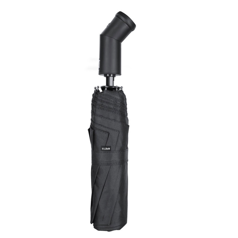 Guarda-chuva de RPET. Com cabo de lanterna giratório prático de 180º em borracha soft touch e botão ON/OFF. Diâmetro de 105 cm, em material 190T RPET pongee. Abertura e fechamento automáticos, com mecanismo à prova de vento e hastes de fibra de vidro. Etiqueta com logotipo RPET. Alimentação por bateria (pilhas incluídas).O material RPET é feito de plástico reciclado, promovendo assim a reutilização de resíduos plásticos e ajudando na sustentabilidade do planeta.