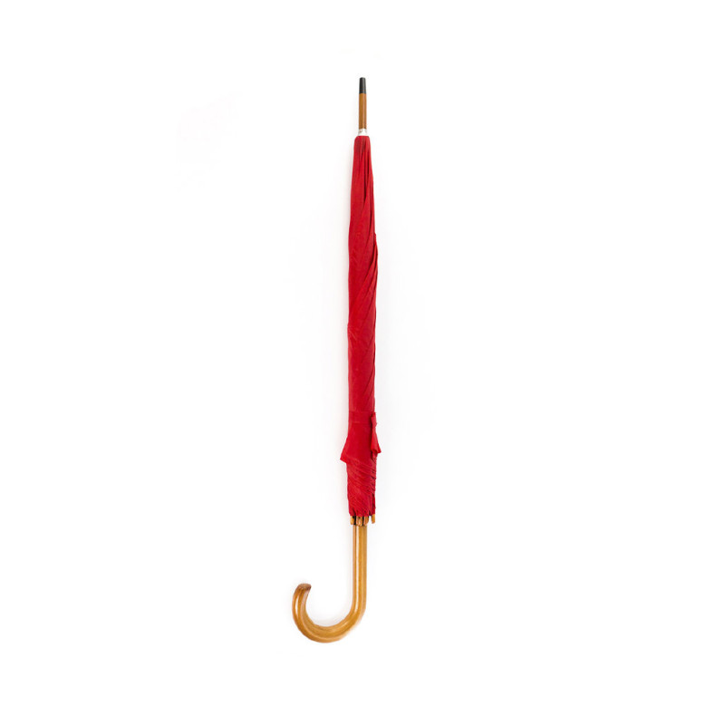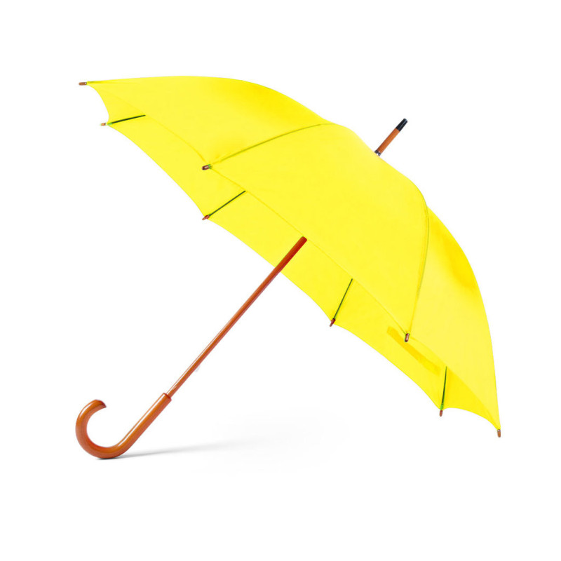 Chapéu de Chuva de 8 painéis confecionado em poliéster. De 105cm de diâmetro, com abertura manual e com varas metálicas em cor preta negro, fecho de velcro e suave cabo de madeira na cor natural, numa variada gama de cores vivas.