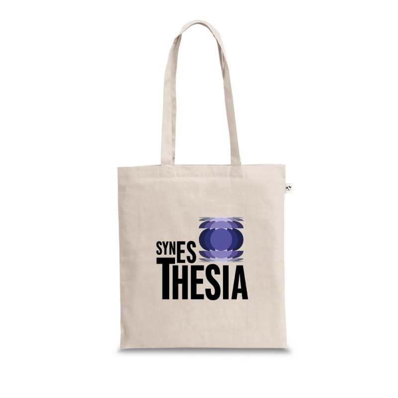 Saco em algodão reciclado (70%) e poliéster (30% rPET) (150 g/m²) com alças de 65 cm. O algodão reciclado é de cor sólida não tingido. A matéria-prima é usada na sua forma e cor originais, sem o uso de produtos químicos de tingimento ou branqueamento, contribuindo para um menor impacto. A cor sólida é obtida pela escolha de fio reciclado com a mesma tonalidade, podendo aparecer impurezas e variações de cor. 380 x 420 mm