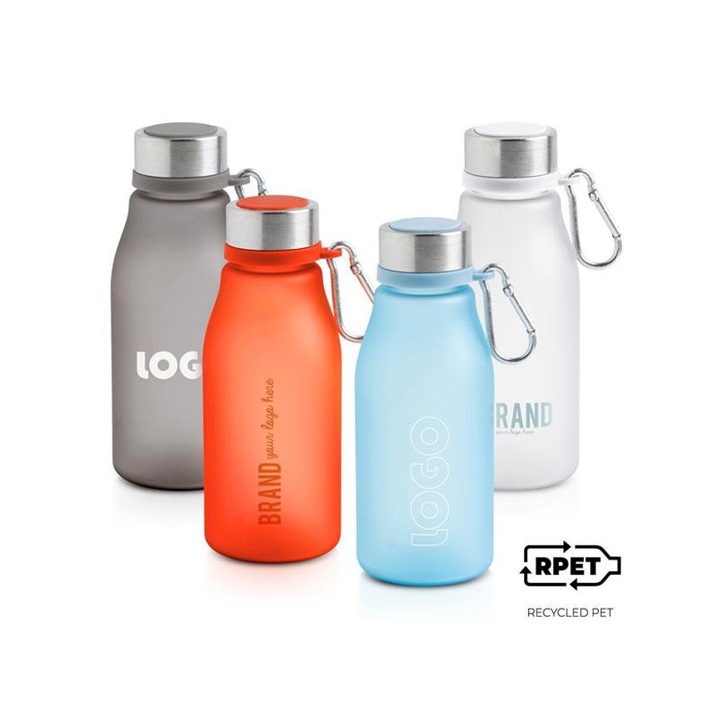 Garrafa de 350 ml em RPET fosco com mosquetão. Prática e fácil de transportar, esta garrafa é fabricada em RPET, um material reciclado e reutilizável, tornando-a numa escolha alinhada com a evolução ecológica. Uma excelente alternativa aos plásticos de utilização única, é ideal tanto para adultos como para crianças. O design inclui uma tampa de rosca segura e um mosquetão funcional, perfeito para levar consigo em qualquer ocasião, promovendo a sustentabilidade no dia a dia.