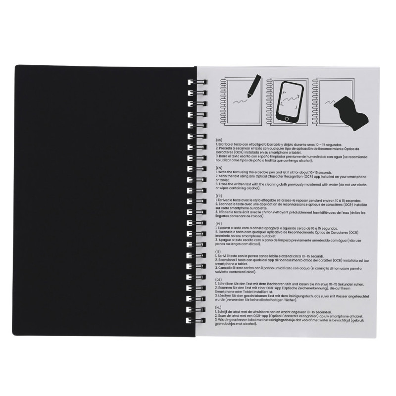 Bloco de notas e caneta apagável com pano de limpeza incluído, proporcionando uma escrita fluida e margem para erros. Bloco em PP com 18 páginas e argolas metálicas. Caneta de cartucho jumbo com tinta preta. Permite escrever, apagar e reescrever sem danificar os documentos. Fabricado em ABS transparente resistente.