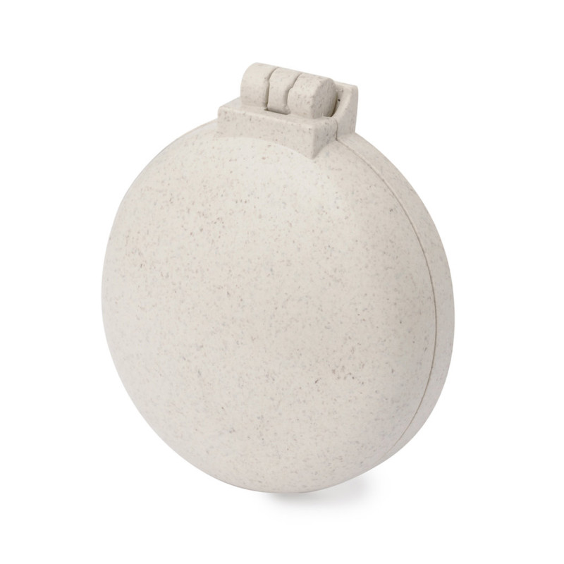 Escova dobrável com espelho fabricada em palha de trigo. Escova prática com cerdas macias e compactas que pode ser dobrada, com espelho no interior da tampa. Apresentada numa bolsa de papel kraft individual. A palha de trigo promove a utilização de matérias-primas naturais, reduzindo assim as emissões poluentes.