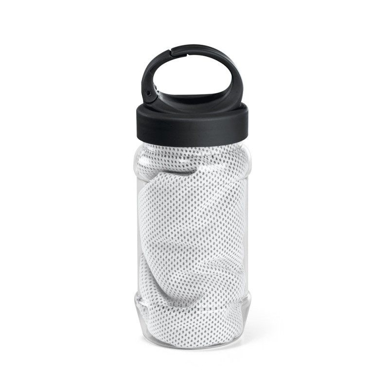 Conjunto de garrafa em PP e PET e toalha de desporto em poliamida e poliéster. Garrafa com gancho, prática para levar para qualquer lugar, com capacidade até 440 mL. Toalha refrescante, quando molhada permanece fria durante algumas horas. Se aquecer, basta abanar, reativando a sua frescura. Toalha reutilizável, lavável na máquina de lavar roupa. Toalha: 300 x 800 mm | Garrafa: ø65 x 183 mm