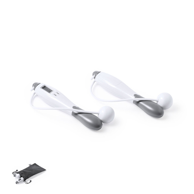 Corda digital feita em resistente ABS. Com pegas ergonómicas e ecrã LCD com botões de ajuste. Apresentada numa bolsa de poliéster RPET com fecho de cordão, feito a partir de plástico reciclado para assim incentivar a reutilização de resíduos plásticos e contribuir para a sustentabilidade do planeta. Etiqueta distintiva RPET na bolsa. Alimentação a pilhas (de botão incluídas).