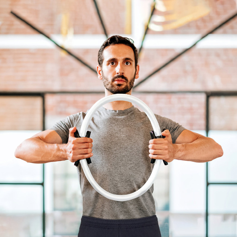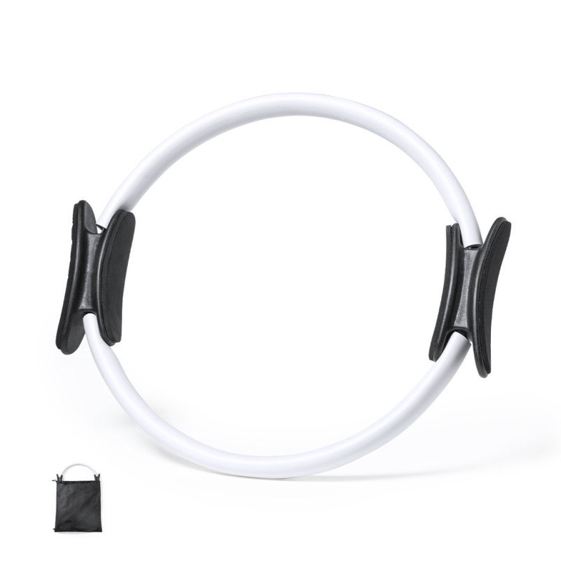 Anel para exercícios fabricado em resistente fibra de vidro com recubrimento em EVA. Pegas ergonómicas em ABS, com manual de instruções em espanhol e inglês. Apresentado em bolsa de non-woven RPET, com fecho de cordão e distintivo RPET na etiqueta.O material RPET elabora-se a partir de plástico reciclado, para assim fomentar a reutilização de resíduos plásticos e ajudar a sustentabilidade do planeta.