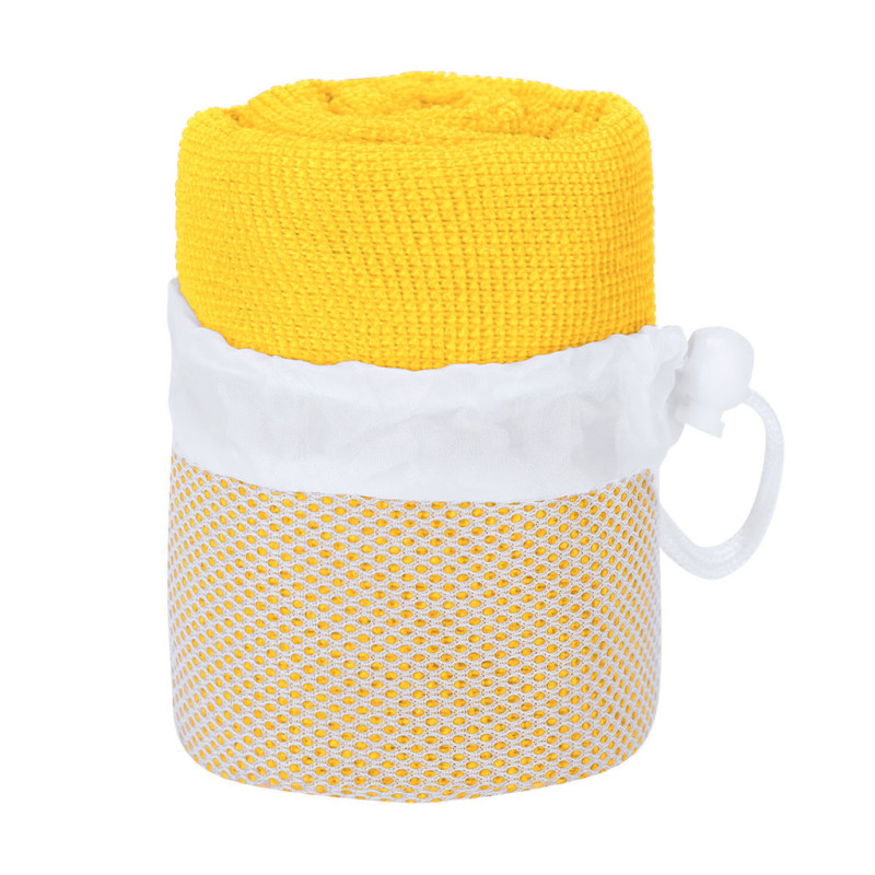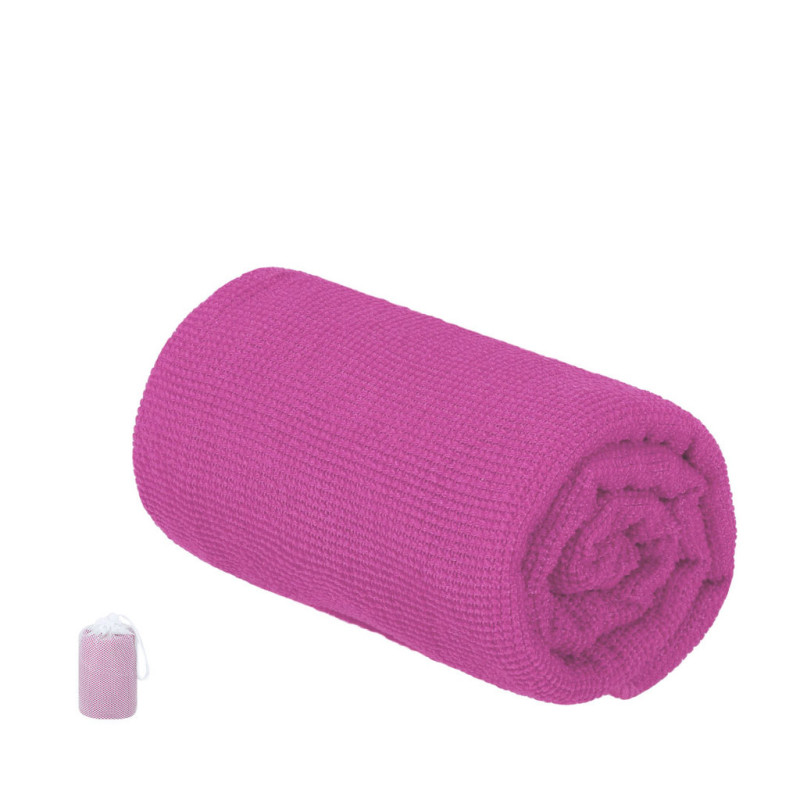 Toalha 100x50cm em microfibra absorvente e macia de 185g/m2 em cores variadas. Apresentado em uma bolsa de malha prática com acessório ajustável.
