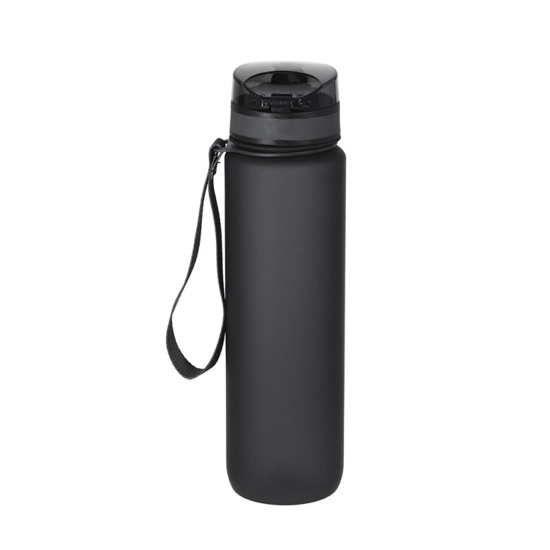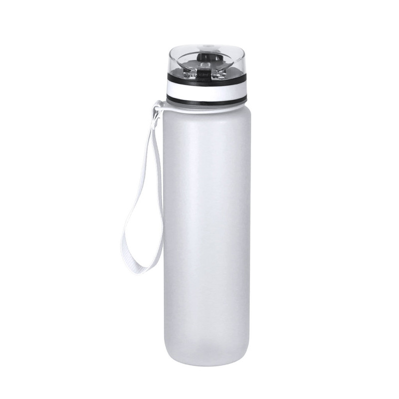 Garrafa com 1L de capacidade, fabricada em RPET resistente com acabamento translúcido mate. Inclui indicador de capacidade em litros e onças, juntamente com frases motivadoras para incentivar a hidratação adequada. Tampa de rosca preta e tampa com capuz de plástico transparente com fecho push. Possui bocal, fecho de segurança e prática alça de transporte. Livre de BPA.