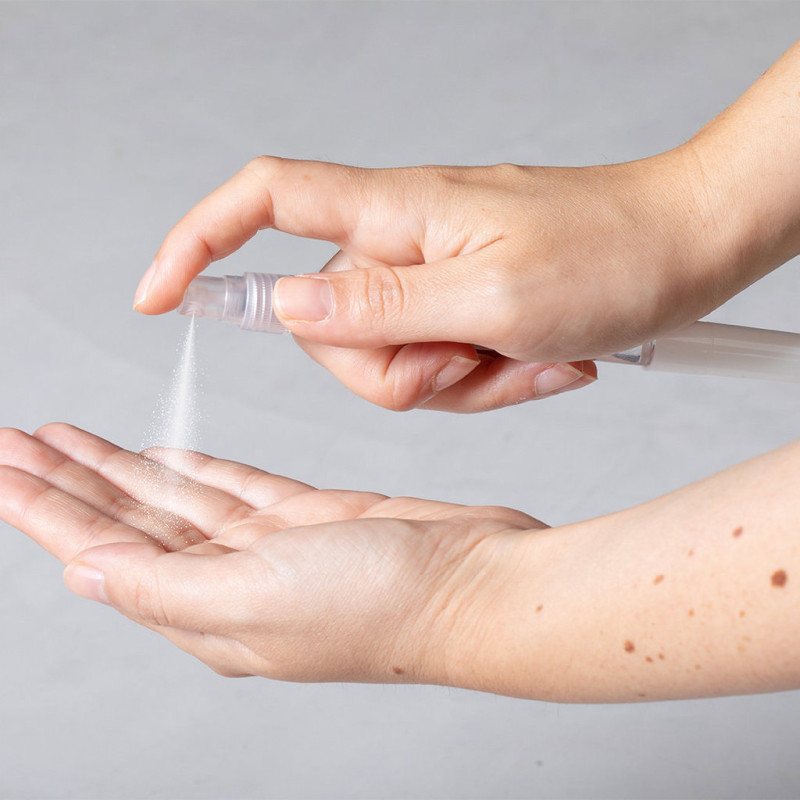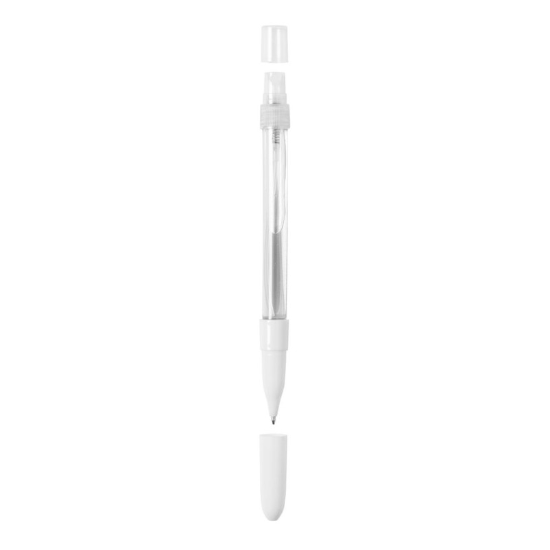 Esferográfica higienizante com pulverizador recarregável integrado e tampa protectora. Acabamento em resistente ABS brilhante e escrita a azul. Capacidade do pulverizador 10 ml. Líquido não incluído. Disponível na cor branco.