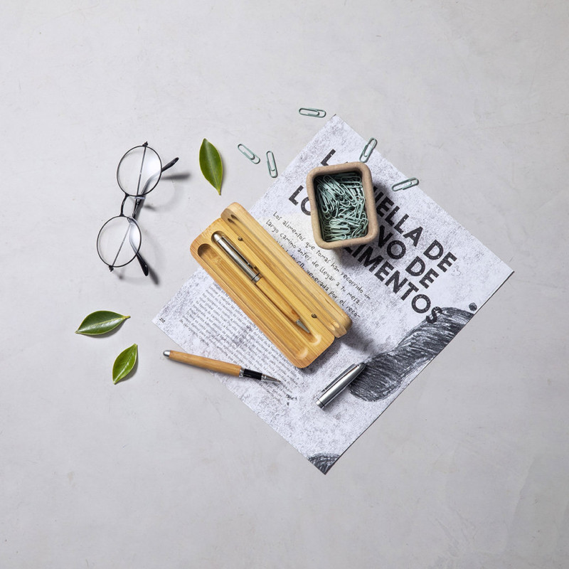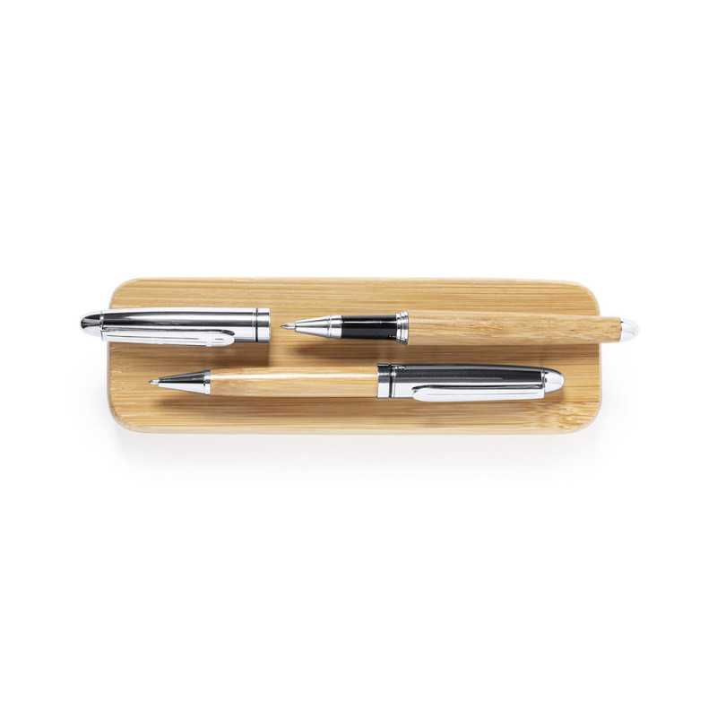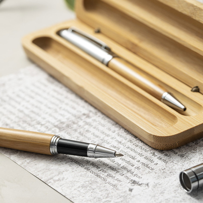 Conjunto de esferográfica e roller da linha nature. Fabricado numa combinação de bambu com metal, para assim fomentar a utilização de matérias primas naturais e reduzir as emissões contaminantes. Esferográfica de mecanismo giratório com tinta azul. Roller com tampa, tinta gel azul e carga jumbo. Apresentado em estojo individual de bambu.