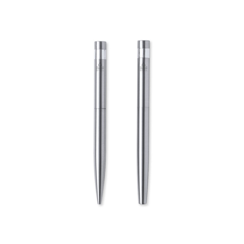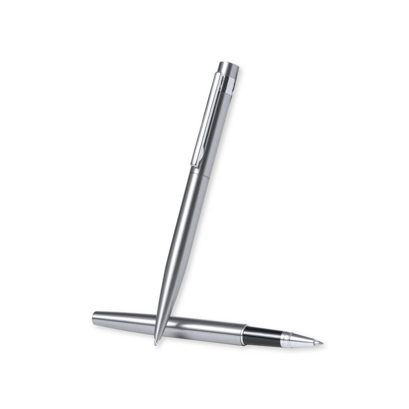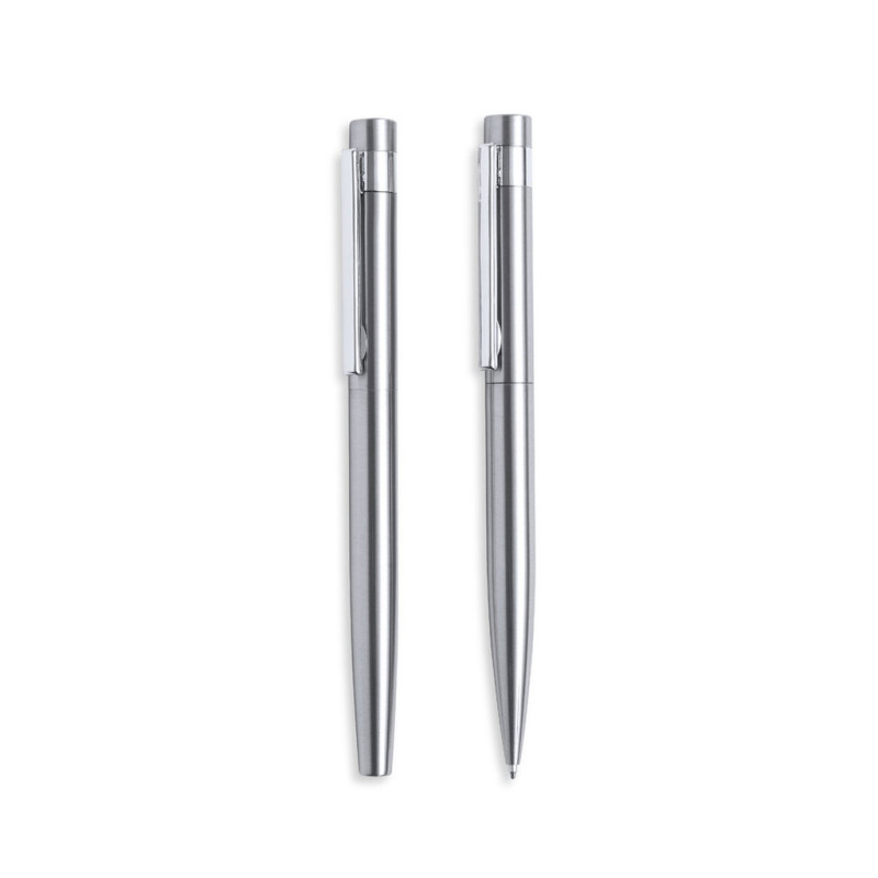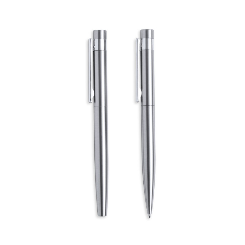 Conjunto eco-friendly de esferográfica e roller, fabricados em aço inox reciclado. Inclui: Esferográfica de mecanismo giratório, com corpo em acabamento prateado e acessórios em cromado. Clip metálico e distintivo aço inox reciclado na parte superior da esferográfica. Carga jumbo e tinta azul.Roller com corpo em cor prateado e acessórios em cromado. Clip metálico e distintivo aço inox reciclado na parte superior da tampa. Carga jumbo e tinta azul.Conjunto apresentado em estojo individual de design kraft com bolsa a condizer.O aço é um dos materiais mais procurados e que pode ser encontrado em quase todo o lado, desde produtos do dia-a-dia a grandes construções. Possui inúmeras propriedades, incluindo a durabilidade e o seu elevado grau de reutilização, o que o torna numa alternativa muito valorizada para soluções de sustentabilidade. Devidamente tratado, permite obter novos recursos de infinita utilização.