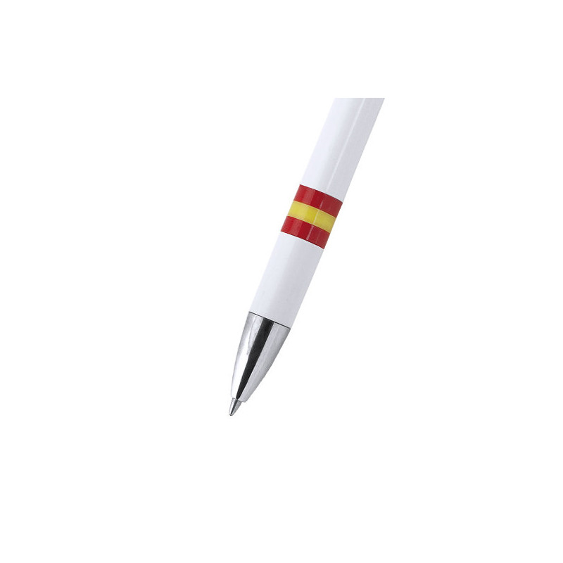 Caneta esferográfica push-uper num elegante design de dois tons com detalhes prateados brilhantes e um corpo macio em branco brilhante com a bandeira nacional espanhola. Com grampo de metal, cartucho jumbo e tinta azul.