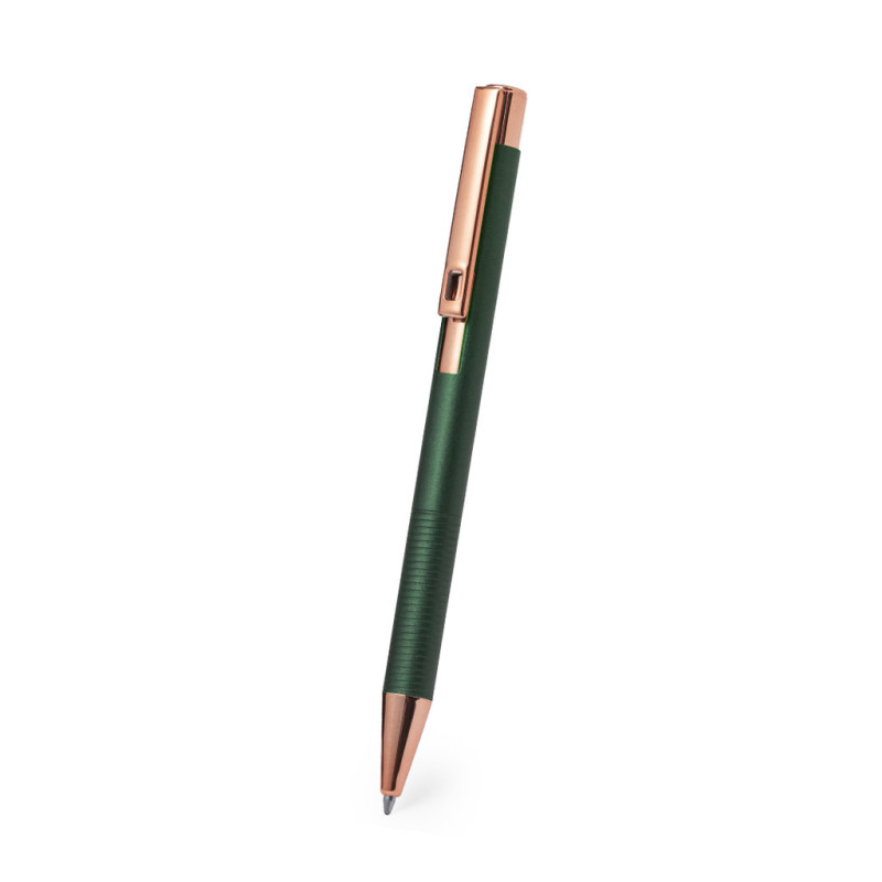 Excelente esferográfica em alumínio com mecanismo pulsador. Corpo resistente em alumínio com acabamento mate e elementos decorativos em elegante acabamento cobre, com corpo numa ampla gama de cores distintas. Clip de metal, tinta azul e carga jumbo. Apresentado em bolsa individual reciclada.