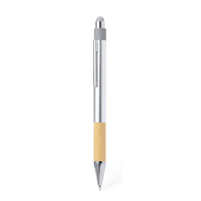 Elegante esferográfica ponteiro de bambu e Alumínio Reciclado com mecanismo pulsador. Corpo en resistente alumínio reciclado com acabamento mate, com cabo de bambu e ponteiro superior cinza. Clip metálico, em tinta azul e com recarga jumbo. Apresentado em bolsa individual reciclada.Materiais como o bambu favorecem a utilização de matérias-primas naturais, reduzindo as emissões poluentes. Provém de uma planta muito resistente e versátil, de crescimento e regeneração rápidos, o que o torna uma excelente alternativa à utilização da madeira tradicional.O alumínio reciclado é um material com possibilidades de reciclagem quase infinitas, sem perder as suas propriedades originais e consumindo menos energia no processo.Certificação GRS (Global Recycled Standard/Norma Global de Reciclagem), que garante a origem reciclada do material utilizado no fabrico do produto.