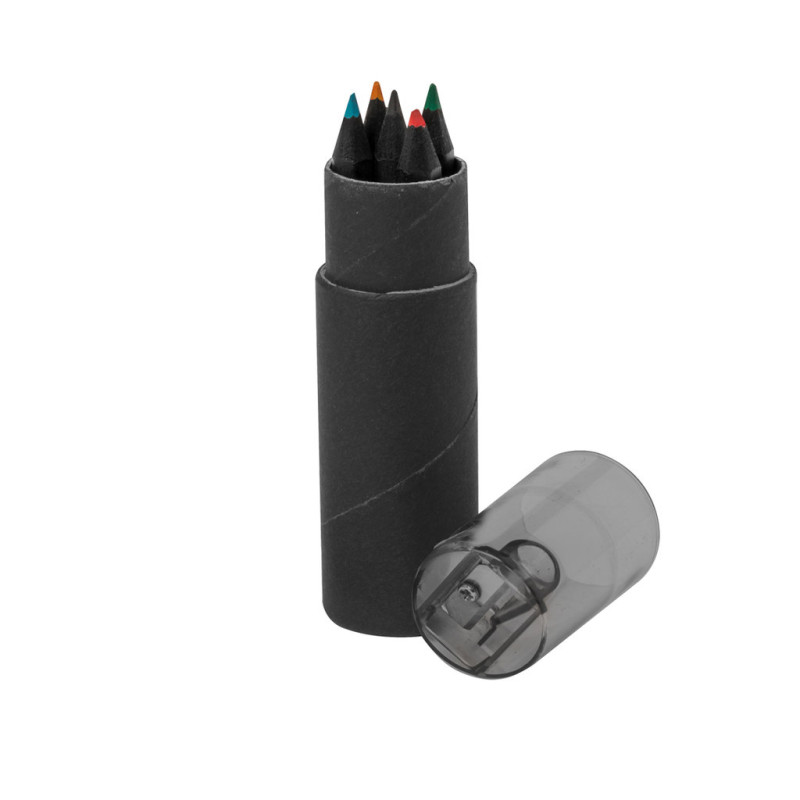 Set de 6 lápis de madeira com acabamento em preto, corpo hexagonal e minas em diversas cores. Apresentado num estojo cilíndrico de cartão reciclado preto, com tampa transparente a condizer e afiadeira integrada.