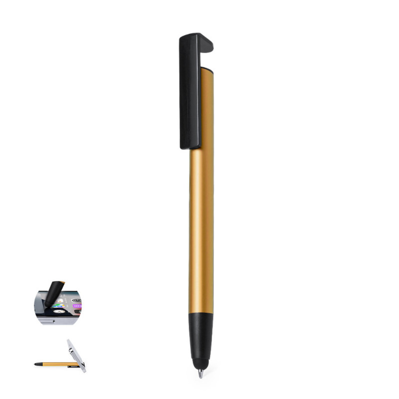 Esferográfica ponteiro com mecanismo pulsador, fabricada em alumínio resistente. Com suporte para dispositivo móvel integrado num clip e corpo macio numa vasta gama de cores metalizadas. Em tinta azul e apresentada individualmente numa bolsa reciclada.