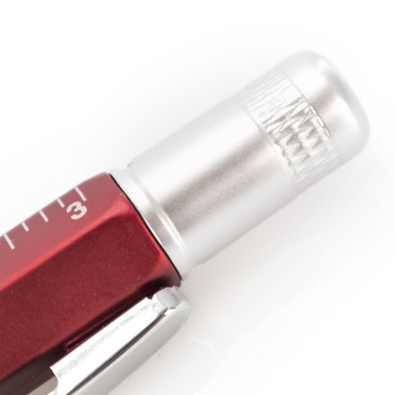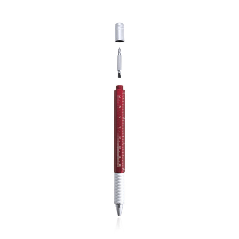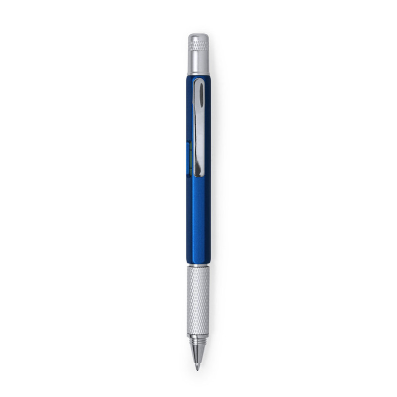 Caneta de bola de ferramentas múltiplas 4 em 1 com mecanismo de torção, em cores variadas e com aperto suave. Com nível embutido no corpo, a régua com sistema métrico em centímetros/polegadas e chave de fenda de cabeça dupla-flat e em forma de estrela. Com clipe metálico e tinta azul.