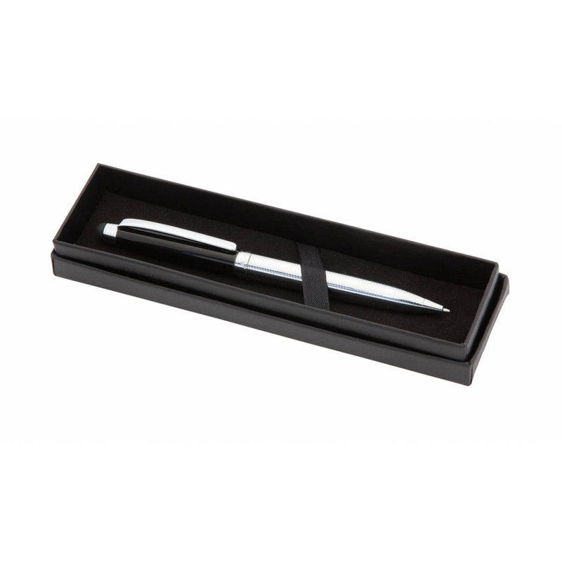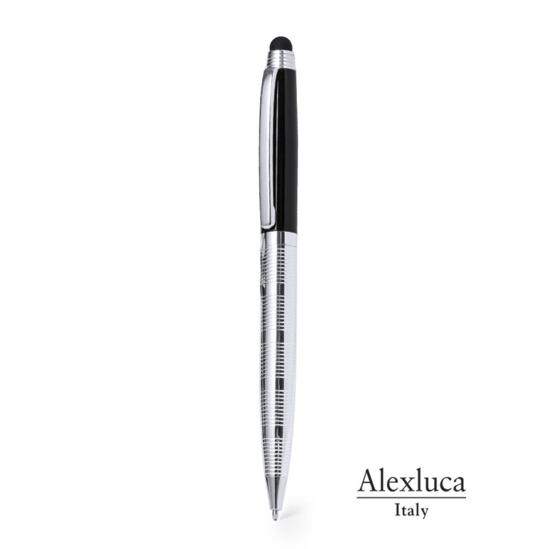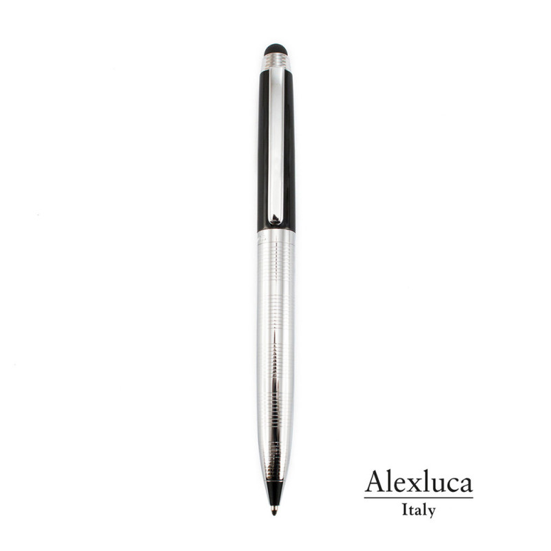 Esferográfica ponteiro de Alexluca de mecanismo giratório com suave corpo metálico, de elegante combinação de cores em prata e preto. Apresentado em estojo individual preto com logotipo da marca. Tinta azul.