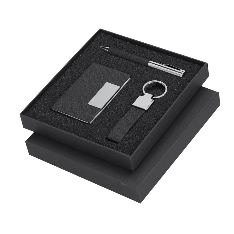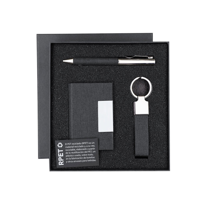 Elegante conjunto em RPET com acabamento preto biton e detalhes metálicos. Inclui:- Porta-cartões de RPET com exterior preto biton combinado e detalhe metálico, 1 compartimento interior e sistema de fechamento magnético.- Caneta de RPET de acabamento preto biton e detalhes metálicos. Com mecanismo giratório e tinta azul.- Chaveiro em RPET de acabamento cor preto biton e acessórios cromados.Apresentado em estojo individual preto. Inclui cartão preto interior com distintivo RPET.O material RPET é elaborado a partir de plástico reciclado, para assim promover a reutilização de resíduos plásticos e ajudar à sustentabilidade do planeta.