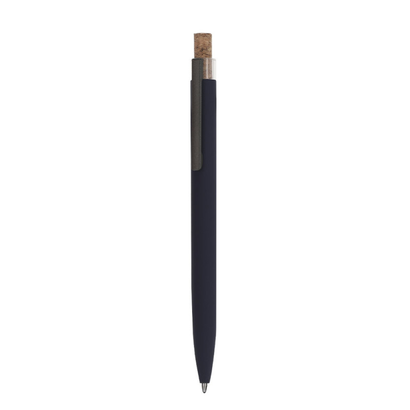Caneta de mecanismo de botão fabricada em alumínio reciclado. Botão em cortiça e corpo com acabamento em borracha, especialmente projetado para marcação a laser. Clip metálico e distintivo alumínio reciclado na parte superior da caneta. De cartucho jumbo e em tinta azul. O alumínio reciclado é um material com possibilidades de reciclagem quase infinitas, sem perder suas propriedades originais e consumindo menos energia nesse processo.Certificação GRS (Global Recycled Standard / Padrão de Reciclagem Global), que garante a origem reciclada do material usado para fabricar o produto.
