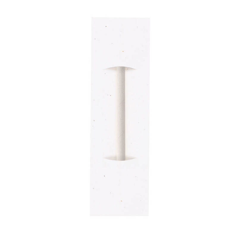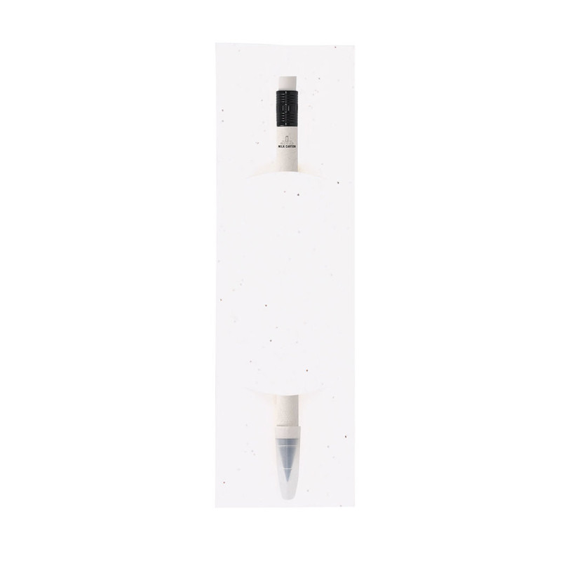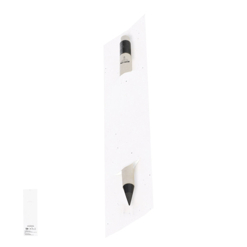 Lápis eterno feito de caixas de leite recicladas, apresentado numa caixa de papel com sementes. Reutilizável e com escrita infinita. Inclui borracha na parte superior do lápis e tampa protetora. Branco na cor, com detalhes em preto. Com crachá de papelão de leite reciclado no corpo. O estojo inclui sementes de petúnia, tornando-o papel plantável no final de sua vida útil. Inclui instruções de plantio na tampa traseira. As embalagens de cartão para leite são maioritariamente compostas por cartão e alumínio. Durante o seu processo de reciclagem, os vários materiais da embalagem são separados para a sua reutilização e reutilização, ajudando assim a percorrer o caminho infinito da economia circular. Este material caracteriza-se pelo seu elevado grau de reciclabilidade, bem como pela sua leveza e resistência.