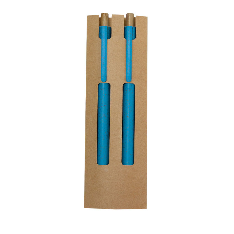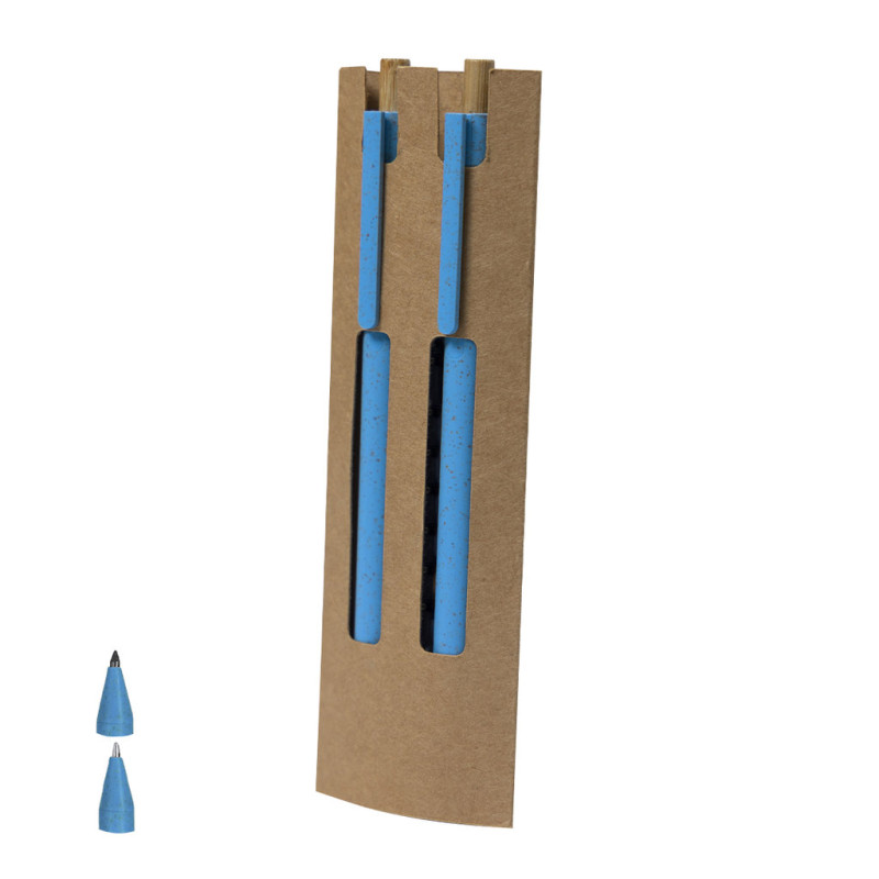 Conjunto de caneta e lápis eterno fabricados em palha de trigo e bambu. Caneta com mecanismo de pressão fabricada em bambu de tinta azul e clipe combinando. E lápis com mecanismo de pressão fabricado em bambu com ponta eterna, para assim usar sempre o mesmo lápis e não gerar resíduos. Apresentados em estojo de papelão reciclado. Com distintivo de palha de trigo impresso.Elaborado com elementos vegetais para assim fomentar a utilização de matérias-primas naturais e reduzir as emissões poluentes.