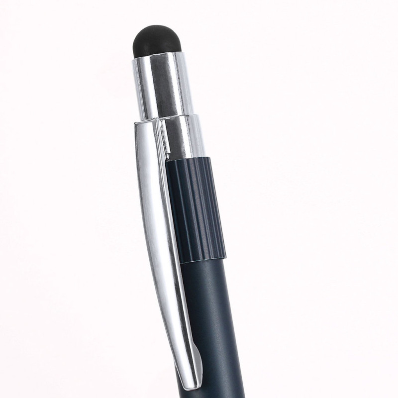 Elegante caneta apontador em Alumínio Reciclado. Mecanismo de botão com acabamento mate e ponta preta na parte superior, tinta azul. Clipe e acessórios com acabamento cromado. Inclui sistema spinner anti-stress. Com logotipo de Alumínio Reciclado gravado.