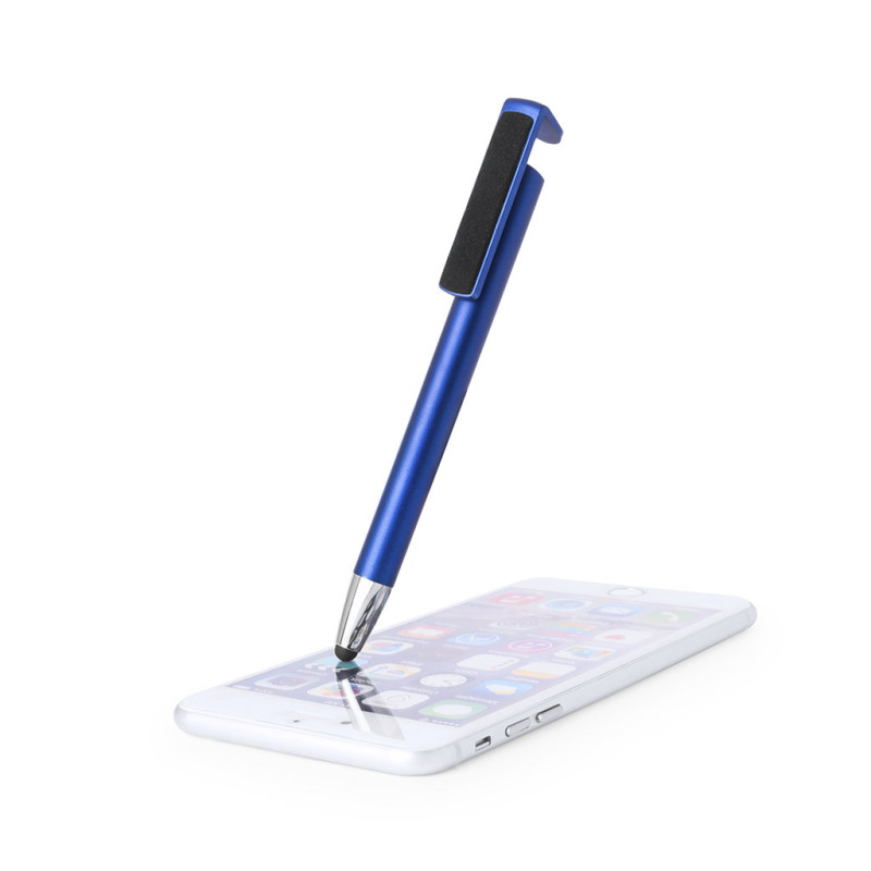 Caneta com ponteiro táctil, multifuncional com mecanismo de botão de pressão, em varias cores e com um clipe de dupla função, especialmente projetado para servir como suporte para telemóvel e também como limpador de ecran. Com corpo em acabamento metálico, especialmente desenhado para impressão em tampografía. Ecrita a preto.