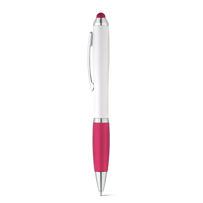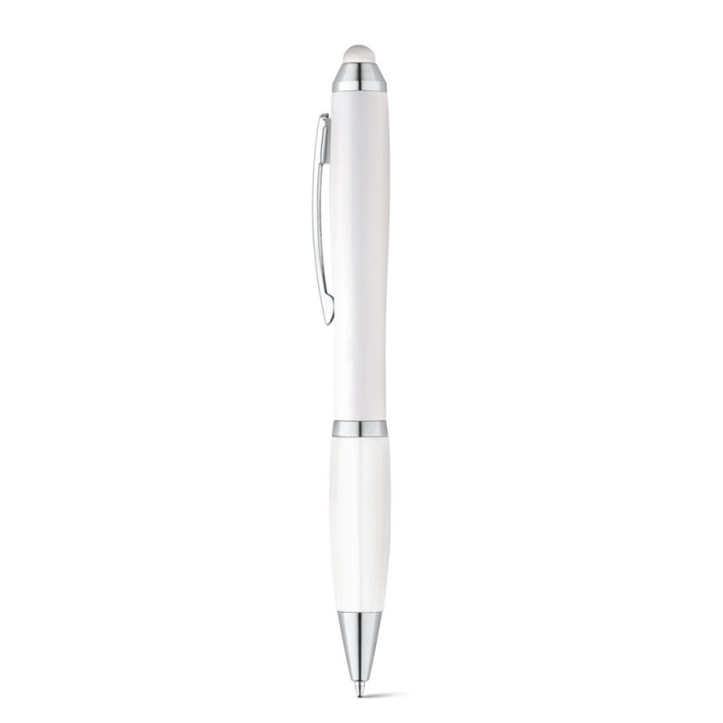 Esferográfica em ABS com clipe em metal e mecanismo twist. Adequada para o uso em dispositivos devido à sua ponteira touch e escrita cómoda com antideslizante. Disponível numa variada gama de cores. Escrita a azul. ø11 x 135 mm