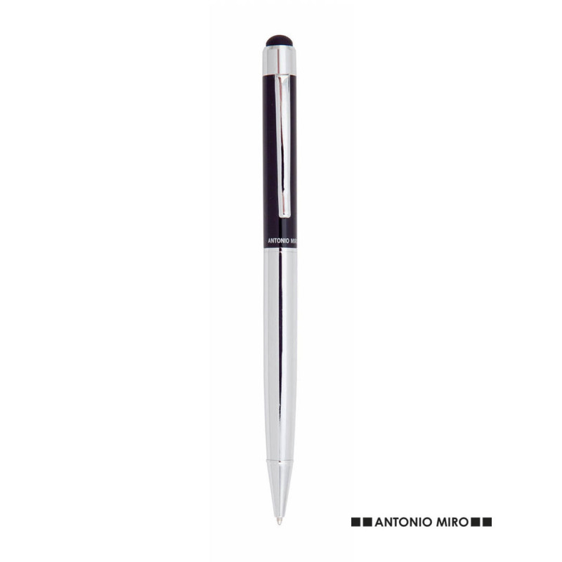 Esferográfica ponteiro de António Miró de mecanismo giratório com suave corpo metálico, de elegante combinação de cores prata e preto. Apresentado em caixa individual de cor preta com logotipo da marca. Tinta azul.