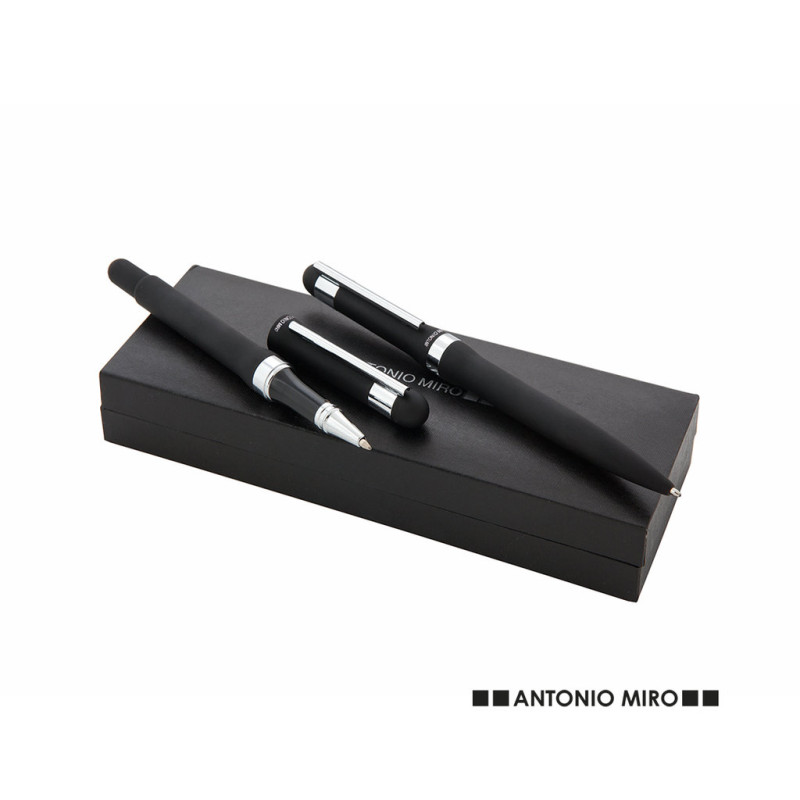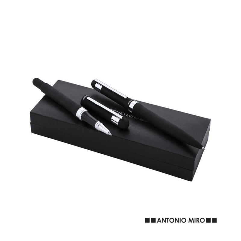 Elegante estabelecido por Antonio Mirãign com caneta de bola de mecanismo de torção e um rolo de capuz com anel original em um design sóbrio. Corpo de metal em acabamento preto brilhante com clipe de prata. Apresentado em uma caixa preta individual elegante com o logotipo da marca e dentro de uma manga. Tinta azul.