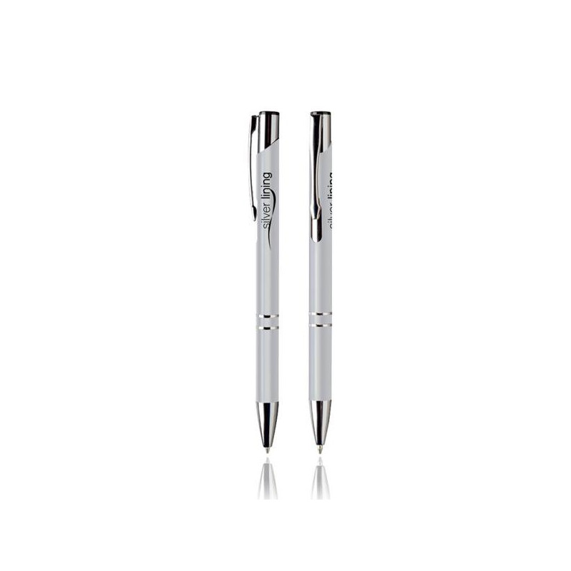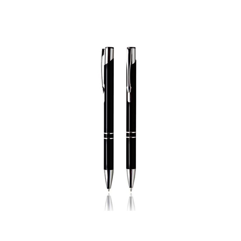 Esferográfica de plástico, clip de metal. Escrita preta, sistema pulsar. Clip em metal prateado. Detalhes prateados na ponta e nos dois anéis.