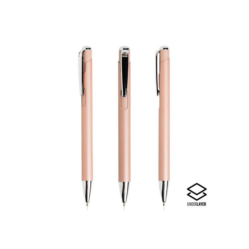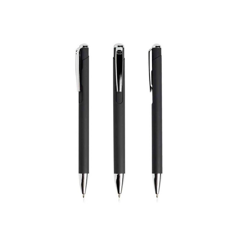 Esferográfica em alumínio, com acabamento em toque de borracha e detalhes prateados. Tal como o modelo 131505, distingue-se pelo design elegante, de inspiração feminina, disponível em cores modernas e apelativas. A gravação a laser garante que o logótipo se harmonize com os acabamentos metálicos. Equipada com sistema de abertura por pressão, utiliza tinta azul para uma escrita fluida e profissional.