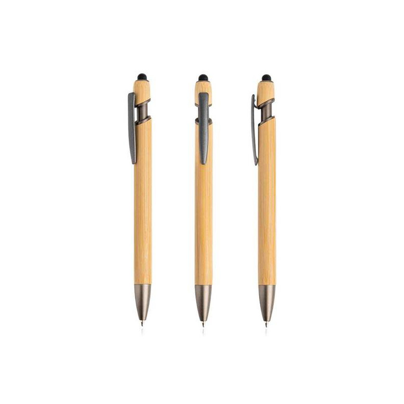 Esferográfica com corpo em bamboo, proveniente de florestas geridas de forma responsável, aliando funcionalidade moderna a uma escolha sustentável. Destaca-se pelo elegante detalhe metálico com acabamento gun metal, clip resistente e sistema de abertura por pressão (pulsar). Na extremidade superior, possui uma ponteira touch colorida (disponível em várias cores), ideal para utilização em ecrãs tácteis. Uma opção ecológica, sofisticada e versátil.
