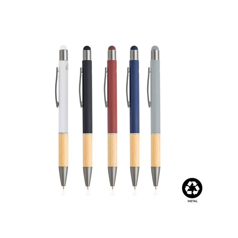 Esferográfica ecológica em alumínio reciclado, com acabamento emborrachado para um toque confortável e moderno. Inclui ponta touch na extremidade superior, ideal para utilização em ecrãs táteis, e uma pega ergonómica em bambu natural, que combina funcionalidade com sustentabilidade.Ao escolher esta esferográfica, está a contribuir para a redução das emissões de carbono e a minimizar o impacto ambiental associado ao desperdício e à não reutilização de mater