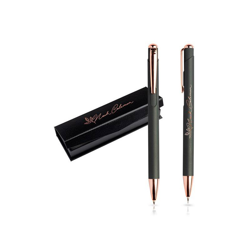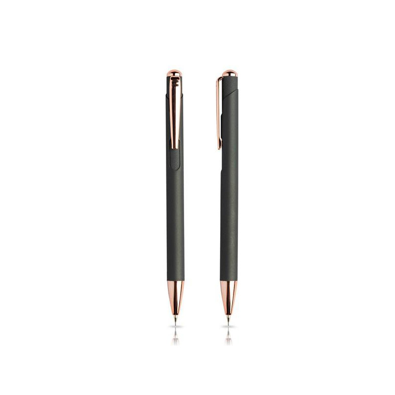 Conjunto de esferográfica e lapiseira em metal, estojo de oferta. Um conjunto inspirado na elegância, que combina uma esferográfica e uma lapiseira com detalhes metálicos. A gravação a laser confere a este conjunto um detalhe ainda mais glamouroso já que o underlayer irá combinar com os detalhes metálicos. A esferográfica é de escrita azul. Ambos os produtos de escrita funcionam em sistema pulsar. Inclui estojo com pala magnética.