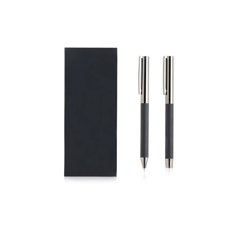 Conjunto sofisticado de design contemporâneo e qualidade premium, composto por uma roller e uma esferográfica em metal e aço inoxidável. O corpo superior distingue-se pelo requintado acabamento gun metal, enquanto a zona inferior em borracha preta assegura maior conforto e uma aderência firme durante a escrita. Os detalhes metálicos na mesma tonalidade conferem-lhe um toque moderno e distintivo. A esferográfica está equipada com carga metálica tipo Parker, ponta de 1,0 mm e tinta preta, oferecendo uma escrita suave, precisa e consistente. Os dois instrumentos são apresentados numa elegante caixa de oferta preta, inserida numa manga de papel, tornando este conjunto uma opção ideal para presentes empresariais ou ocasiões especiais. Resistente, funcional e cheio de estilo, foi concebido para quem valoriza elegância e desempenho em cada traço.