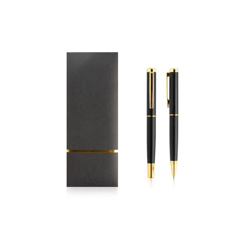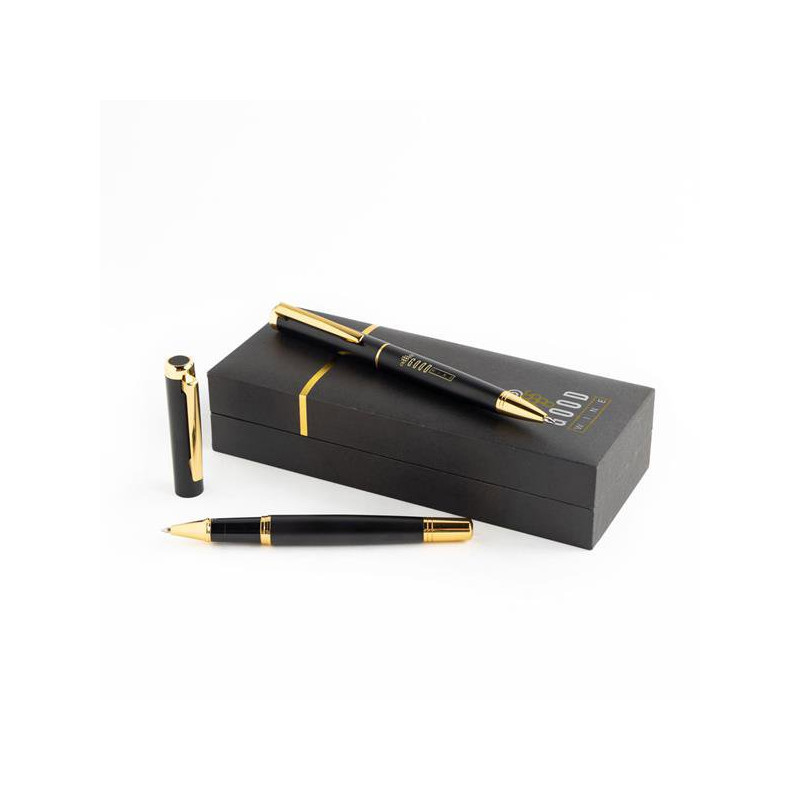 Conjunto de roller e esferográfica em metal, estojo de oferta. Neste conjunto vai encontrar uma roller e uma esferográfica de escrita azul, com um ar clássico e elegante. Como linha condutora, encontrará os dourados que irão estar nos detalhes dos dois elementos de escrita e na caixa oferta que vem com este conjunto.