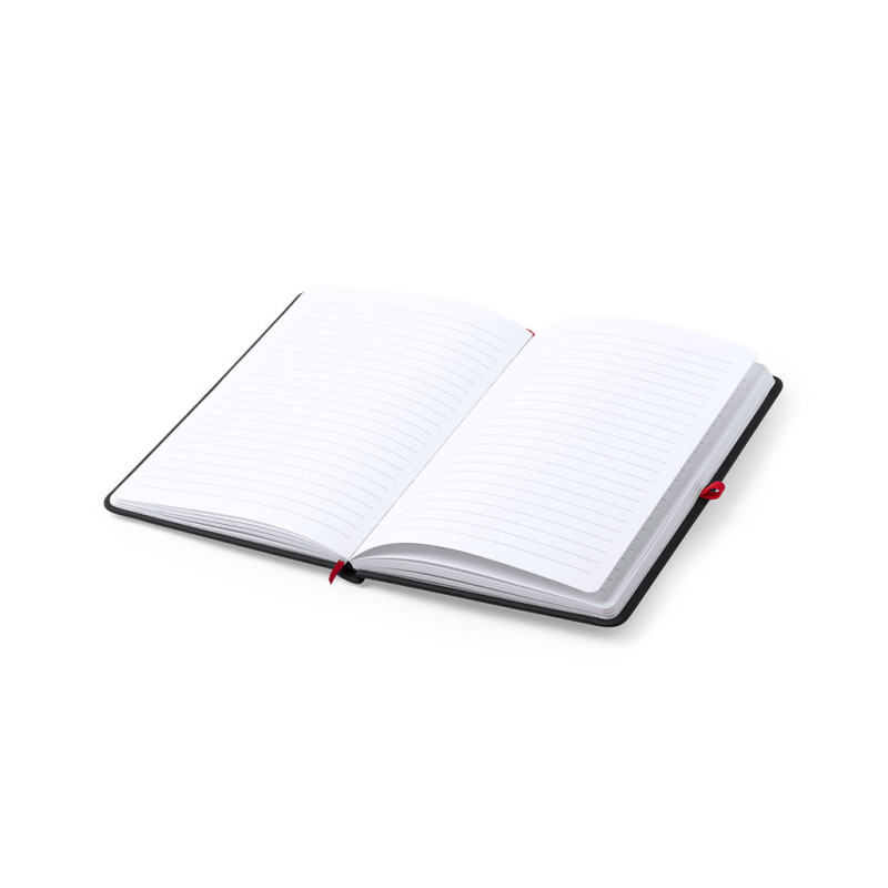 Bloco de notas com capas em PU de toque suave. Na elegante cor preta, com elástico, marcador e suporte elástico para caneta em cores vivas. Revestimento externo especialmente projetado para marcação a laser, com o qual poderá obter a publicidade ou marca perfeitamente gravada em cores a combinar com a do artigo. Inclui 100 folhas pautadas.