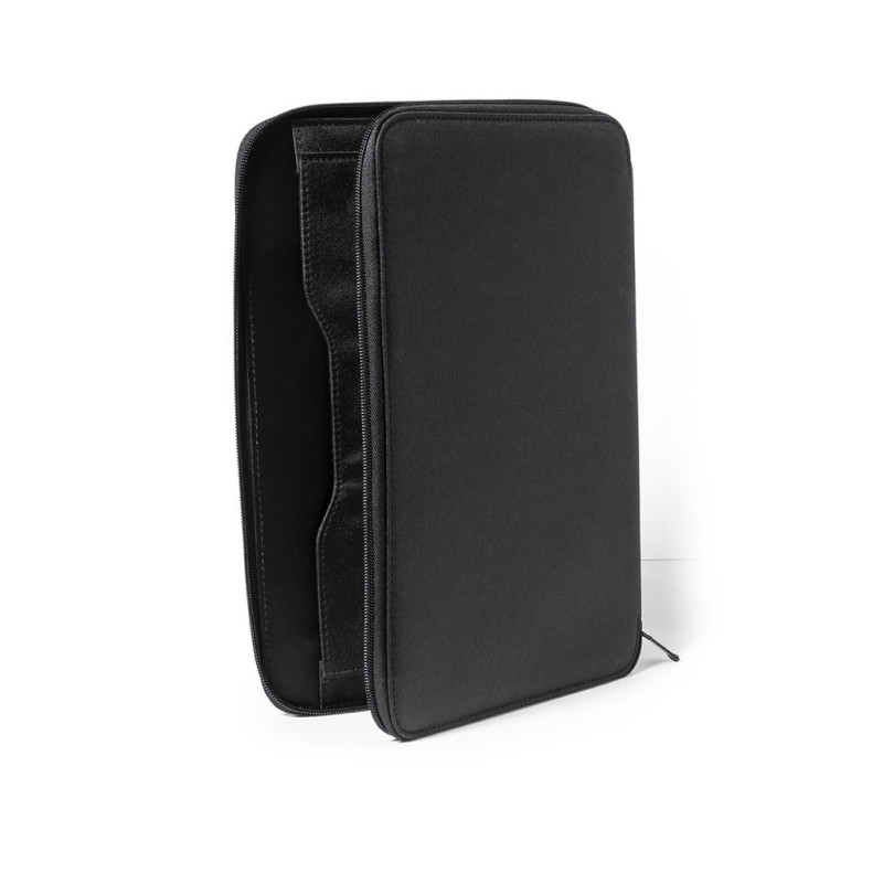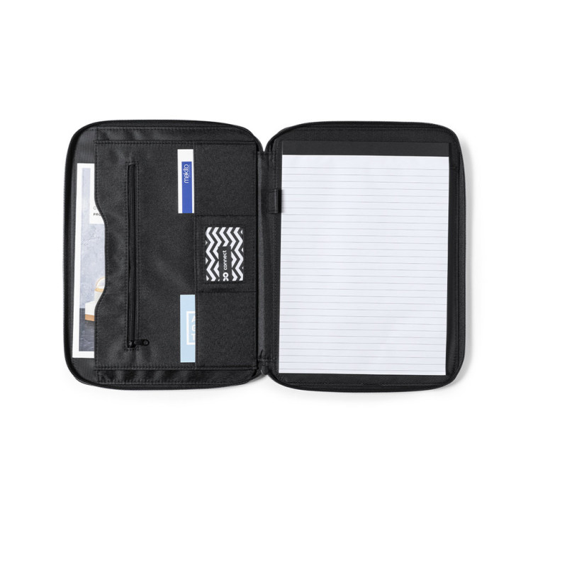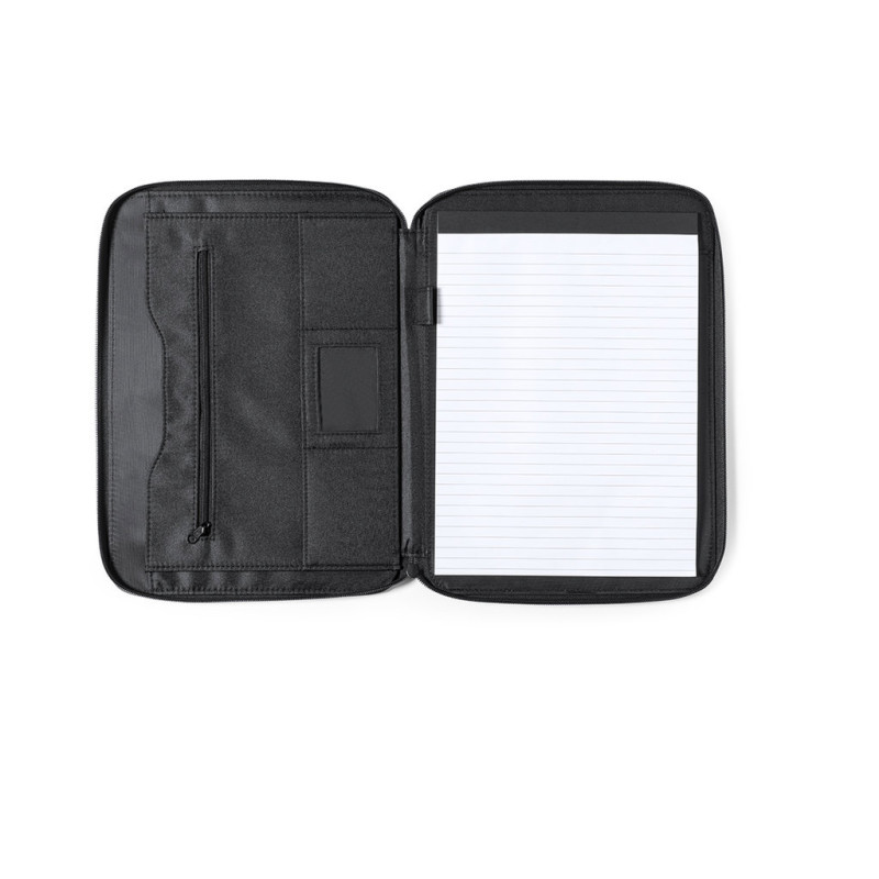 Saco de documentos elegante com fechamento de zíper na microfibra macia. No interior, com o bloco de notas de 20 folhas com layout listrado, um bolso com zíper, um bolso de aba, porta -cartas e um porta -canetas. Com elegante placa de metal na frente para impressão a laser.