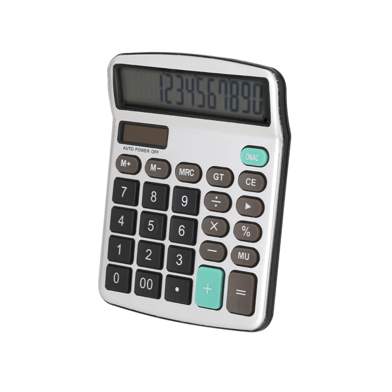 Calculadora de 12 dígitos fabricada em resistente alumínio e ABS, com teclas de tato suave. Funcionamento duplo com energia solar e alimentação auxiliar com pilha de botão (incluída, com filme protetor). Ecrã LCD e mecanismo de desligar automático. Apresentada em caixa individual de design kraft.