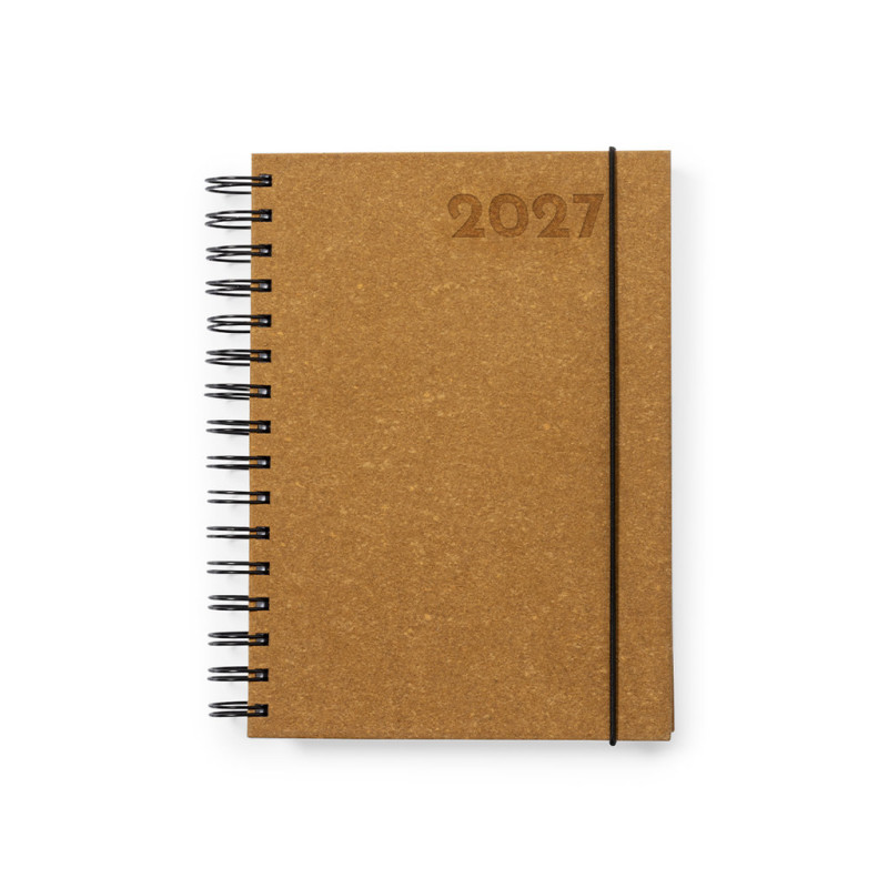 Agenda de tamanho A5 fabricada em elegante e sustentável couro reciclado. Com capas rígidas e elástico de fecho. Com distintivo couro reciclado.Desenho página dia, zona de anotações por dia e páginas com esquina recortada para marcar o dia. Em 2 idiomas: castelhano e inglês. Apresentada em caixa kraft. O couro reciclado resgata as fibras descartadas nos processos de fabricação do couro, minimizando o desperdício de material, contribuindo para reduzir o impacto ambiental e mantendo as suas propriedades originais.