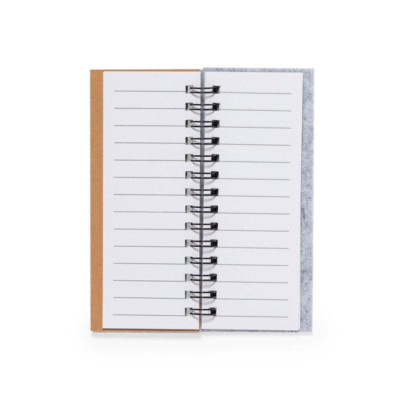 Bloco de notas fabricado em suave feltro RPET. Com distintivo RPET na capa. Inclui:Bloco de argolas de 30 folhas brancas com disposição pautada e distintivo reciclado em ambos os lados.25 notas adesivas médias.125 mini notas adesivas em várias cores.Apresentado em bolsa individual reciclada.
