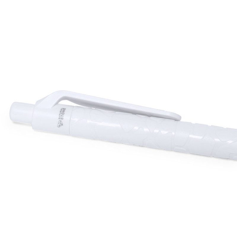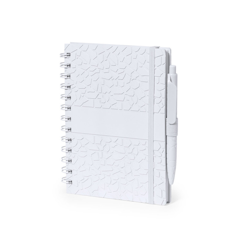 Conjunto de caderno e esferográfica. Conteúdo: Caderno de argolas com capas rígidas fabricado à base de extratos de pedra em elegante acabamento de cor branco e suporte para a esferográfica. Capa de design único com relevo recortado. De 70 folhas de cor branca e disposição pautada, com distintivo Natural Stone.Esferográfica de linha nature e mecanismo pulsador. Corpo recortado fabricado com extratos de pedra natural, ajudando a reduzir a redução do uso de plásticos, além de proporcionar um acabamento suave e resistente. Em cor blanco e com distintivo Natural Stone na parte superior. De carga jumbo e em tinta azul.O material usado na elaboração do caderno é 100% reciclável e livre de cloro, com propriedades impermeáveis, altamente resistente e lavável, convertendo-se assim numa alternativa ecológica e sustentável frente ao papel convencional, cuja origem não é o tradicional nem provém das árvores.Apresentado em bolsa individual reciclada.