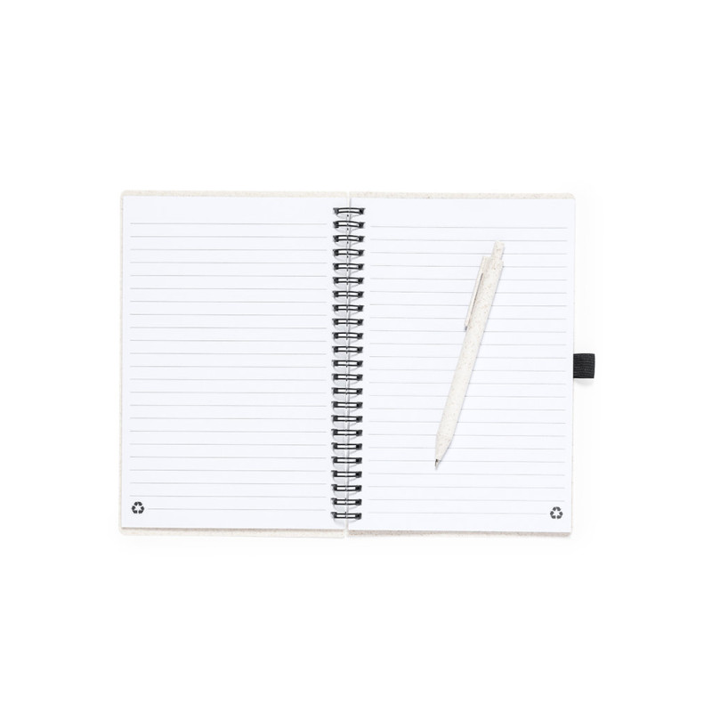 Conjunto de caderno e esferográfica. Caderno de argolas com capas em palha de trigo e suporte para a esferográfica. De 80 folhas com design eco e disposição pautada. Esferográfica de mecanismo pulsador, com corpo em palha de trigo e tinta azul. Com distintivo Wheat Straw. Apresentado em bolsa individual reciclada.Elaborado com elementos vegetais para assim fomentar a utilização de matérias-primas naturais e reduzir as emissões poluentes.