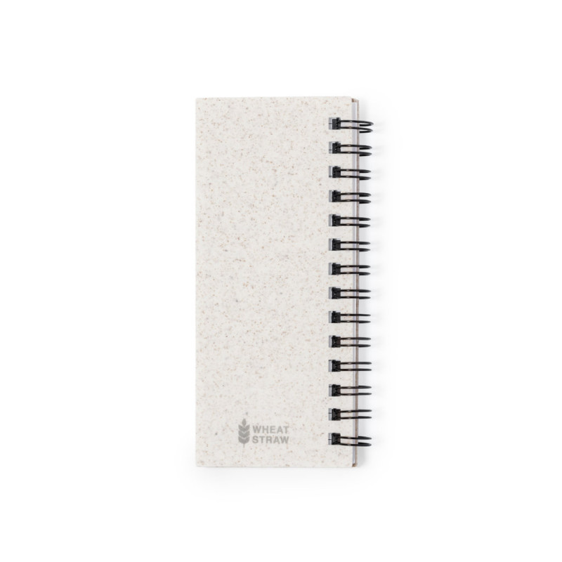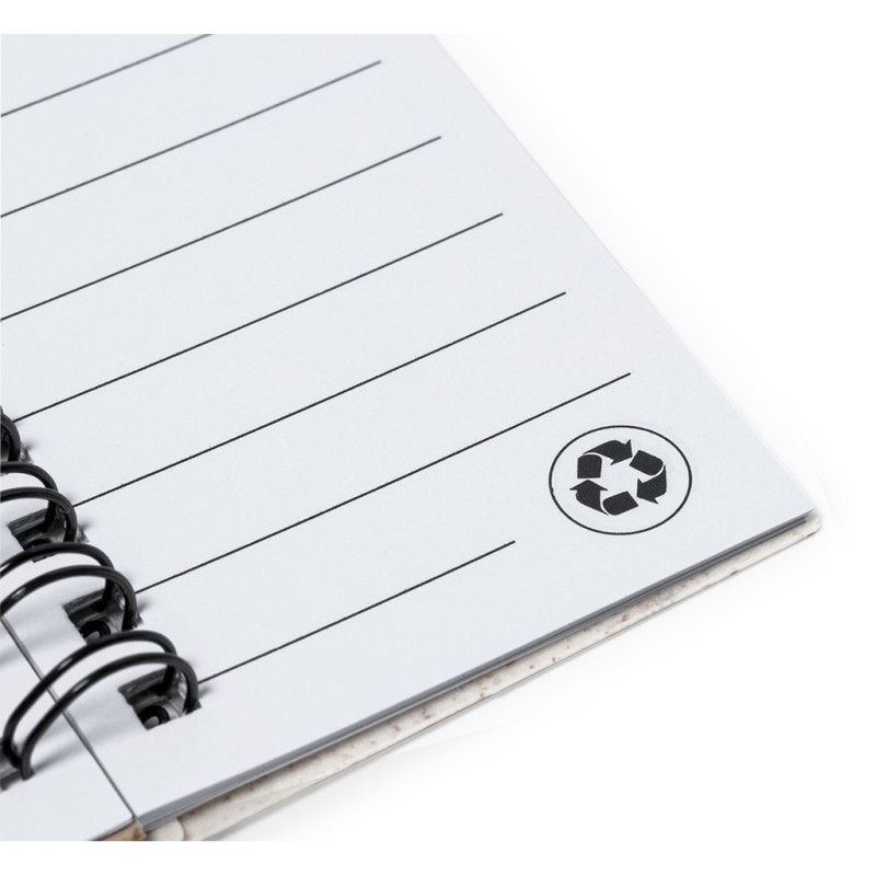 Bloco de notas com capas em fibra de trigo. Com distintivo wheat straw na contraportada. Inclui:Bloco de argolas de 30 folhas brancas com disposição pautada e distintivo reciclado em ambos os lados.25 notas adesivas médias.125 mini notas adesivas em várias cores. Elaborado com elementos vegetais para assim fomentar a utilização de matérias-primas naturais e reduzir as emissões contaminantes.Apresentado em bolsa individual reciclada.